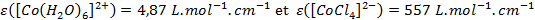 Les deux géométries envisagées pour nos complexes sont la géométrie tétraédrique et la géométrie tétraédrique. D’après les valeurs de nos coefficients d’extinction molaire, on peut en déduire que le complexe aqua est centrosymétrique alors que le complexe chloro ne l’est pas. On en déduit alors que le complexe aqua est en géométrie octaédrique alors que le complexe chloro est en géométrie tétraédrique. Par ailleurs, on peut corréler ce résultat à deux éléments :