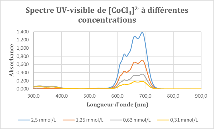 On observe trois pics d’absorbance sur ce diagramme aux longueurs d’onde 625 nm, 662 nm et 689 nm. Nous avons souhaité déterminer le coefficient d’extinction molaire associé au complexe [CoCl4]2-. Pour cela, on se place à 689 nm et on relève l’absorbance correspondantes pour les quatre solutions. D’après la loi de Beer–Lambert, on sait que :